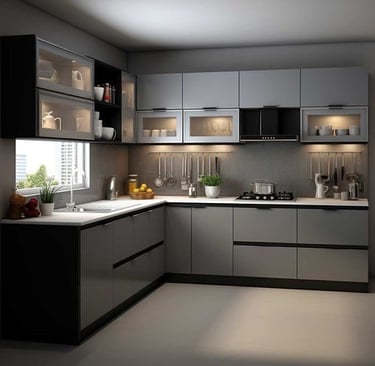 Full home interior solutions. Modular Kitchen, Bedroom, Living Room and Bathroom.